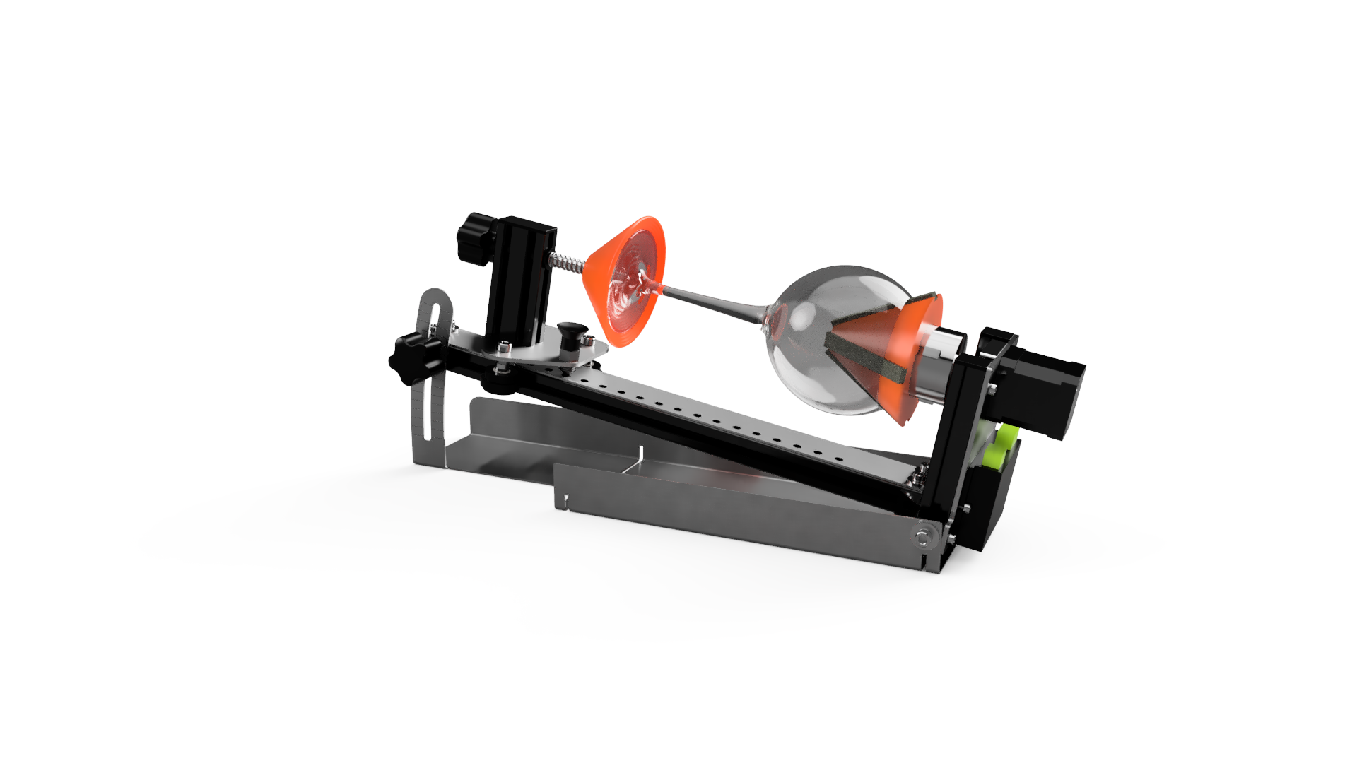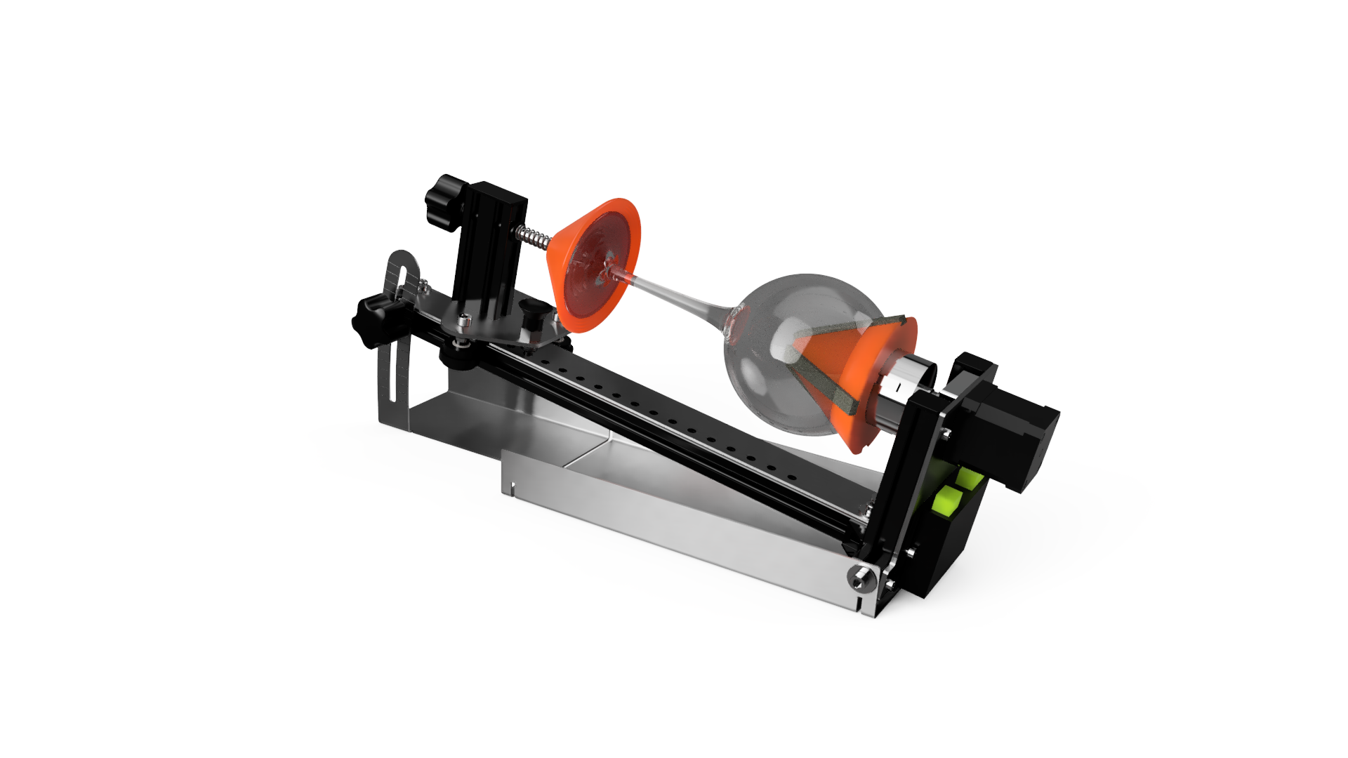 Dzięki bezstopniowej regulacji kąta tego obrotowego modułu grawerującego możesz grawerować pod kątem. Pozwala to na perfekcyjne grawerowanie laserowe przedmiotów, takich jak kieliszki do wina, które są trudniejsze. Dzięki sprężynowemu zawieszeniu obiekt zawsze idealnie się centruje, a kieliszek do wina można szybko postawić i wyjąć.