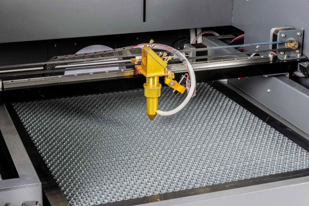 Maszyna laserowa CO2 LITE o mocy 60 W z powierzchnią roboczą 600 x 400 mm, w tym stół o strukturze plastra miodu. Opcjonalnie 40 W i/lub łóżko robocze 400 x 400 mm.